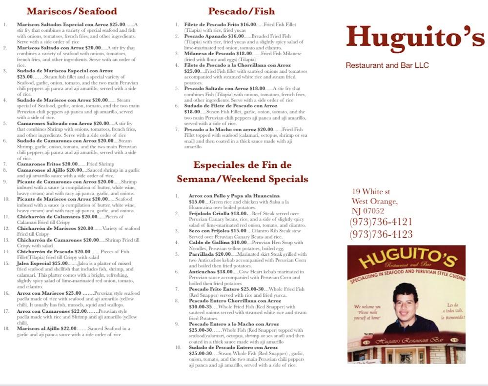 Welcome to Huguito's Restaurant and Bar, your premier destination for authentic Peruvian cuisine in West Orange, NJ. Nestled on White Street, we invite you to savor our delectable dishes, from local specialties to healthy options served in a relaxed and stylish atmosphere. Enjoy our excellent cocktails and vast beer selection, perfect for lunch, dinner, or a solo outing. With amenities like wheelchair accessibility, carryout, and late-night service, we cater to all our guests' needs. Join us for brunch or a casual meal, and experience the vibrant flavors of Peru at Huguito's—where every visit feels like home!